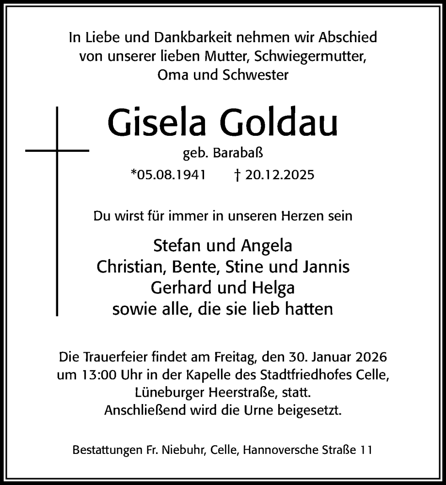 Hier finden Sie alle Traueranzeigen aus der Zeitung, die bisher für Gisela Goldau erschienen sind.
